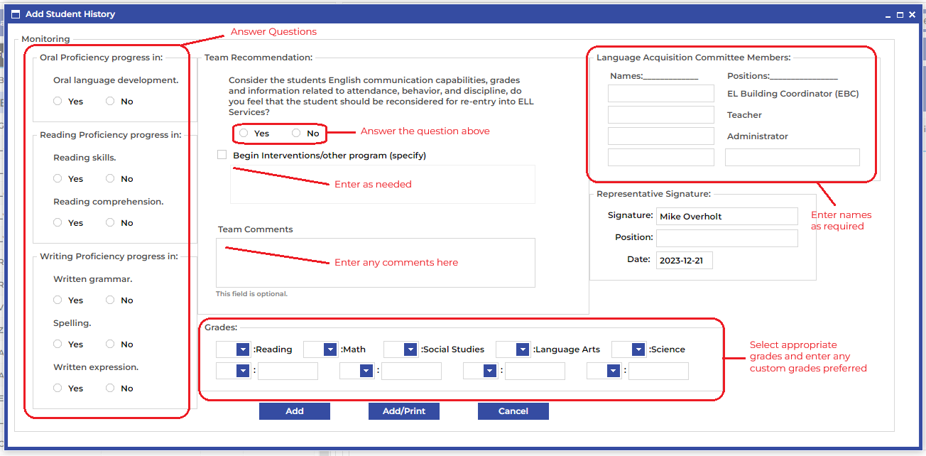 Monitoring records collect information pertaining to a student that has exited the EL program and is designed to inform whether or not that student is continuing to make progress.