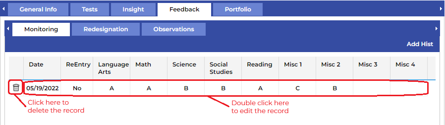 The records listed are the reports that have been created for the student selected. You can edit a record by double clicking it or you can delete it by clicking on the trash can to the left of the record.